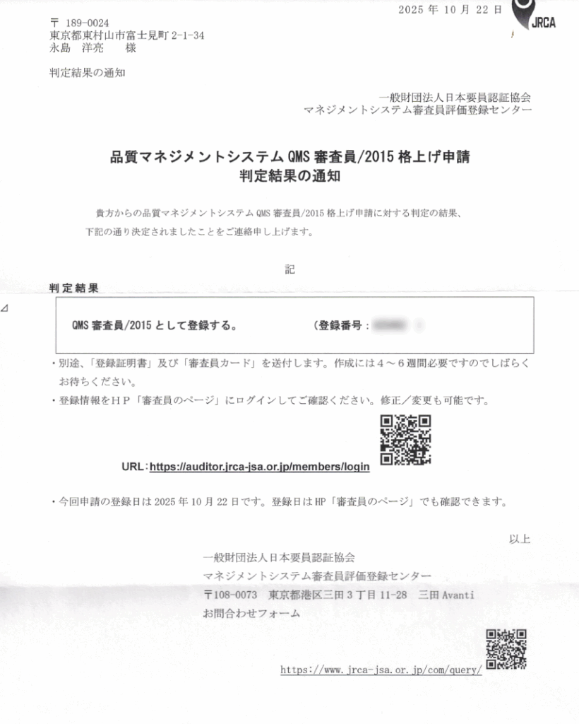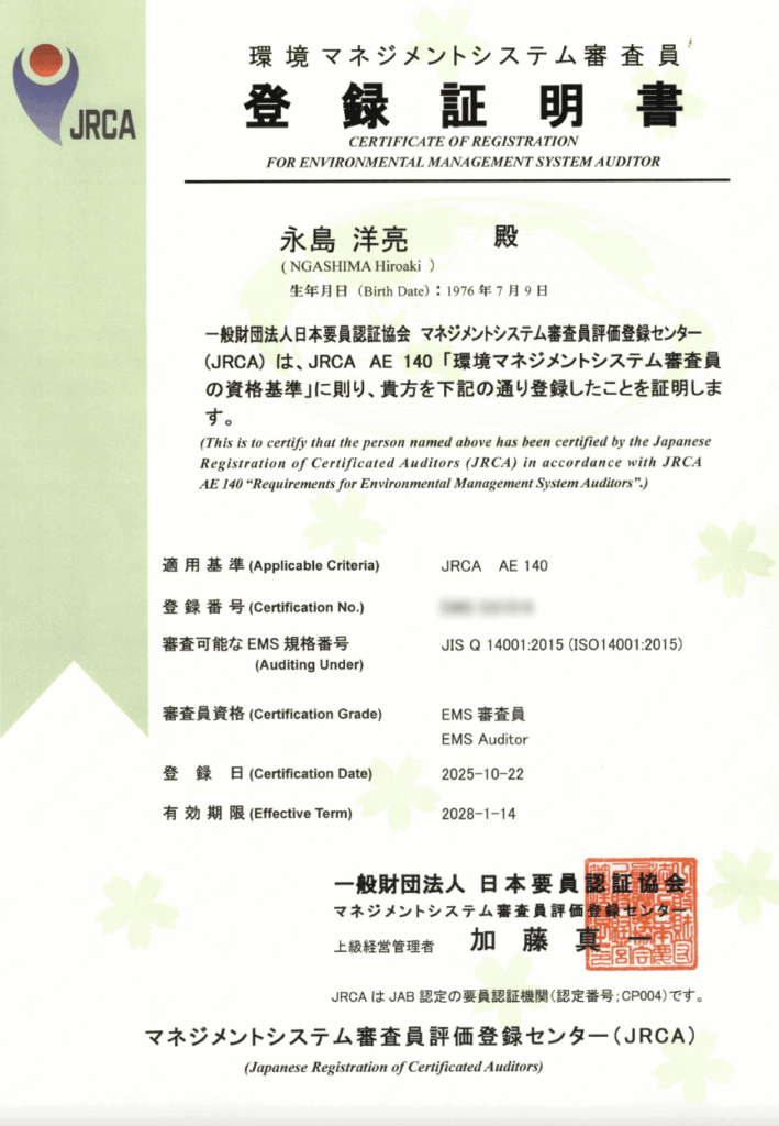 「JRCA承認 ISO9001/14001 QMS/EMS審査員」への格上げ登録を完了いたしました。